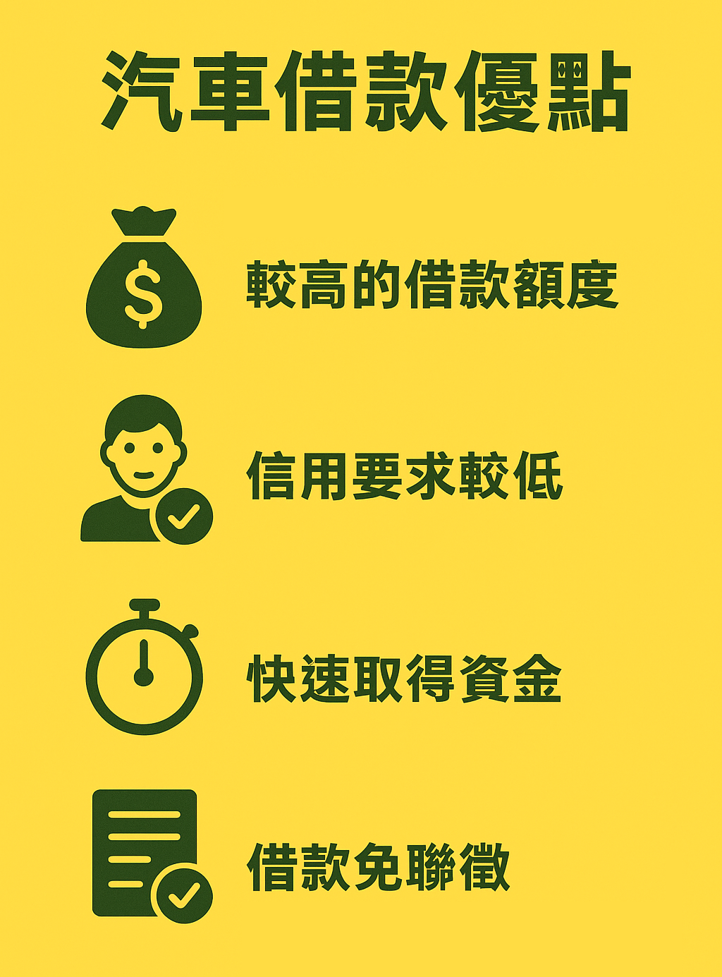 • 較高的借款額度:因為有汽車作為抵押,借款人可能獲得較高的貸款額度。